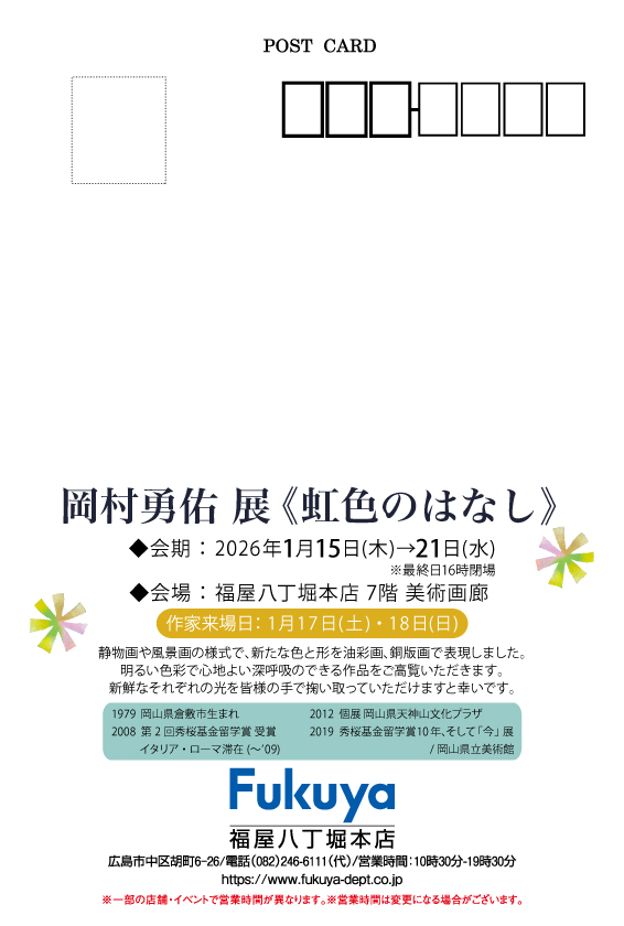 | 岡村 勇佑展《虹色のはなし》 2026年1月15日(木)~21日(水) 福屋八丁堀(広島市) 小画廊 |